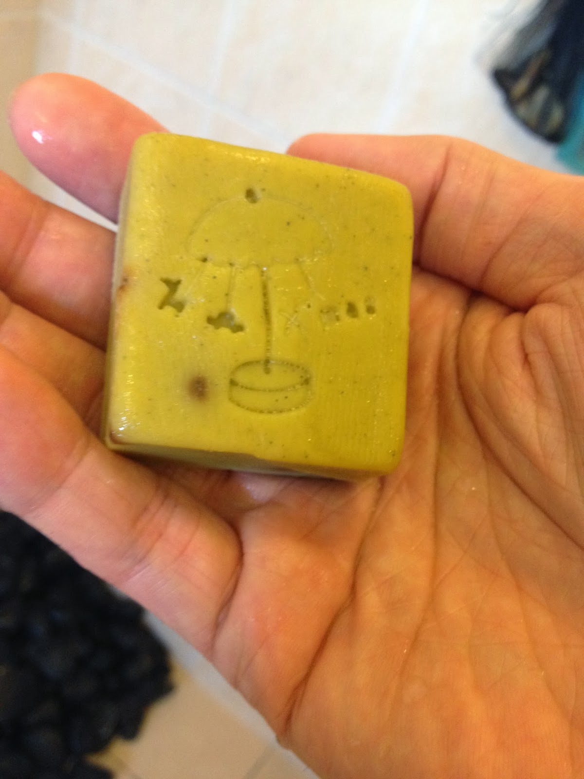 洋甘菊胡桃润肤皂,洗湿了的样子。 |